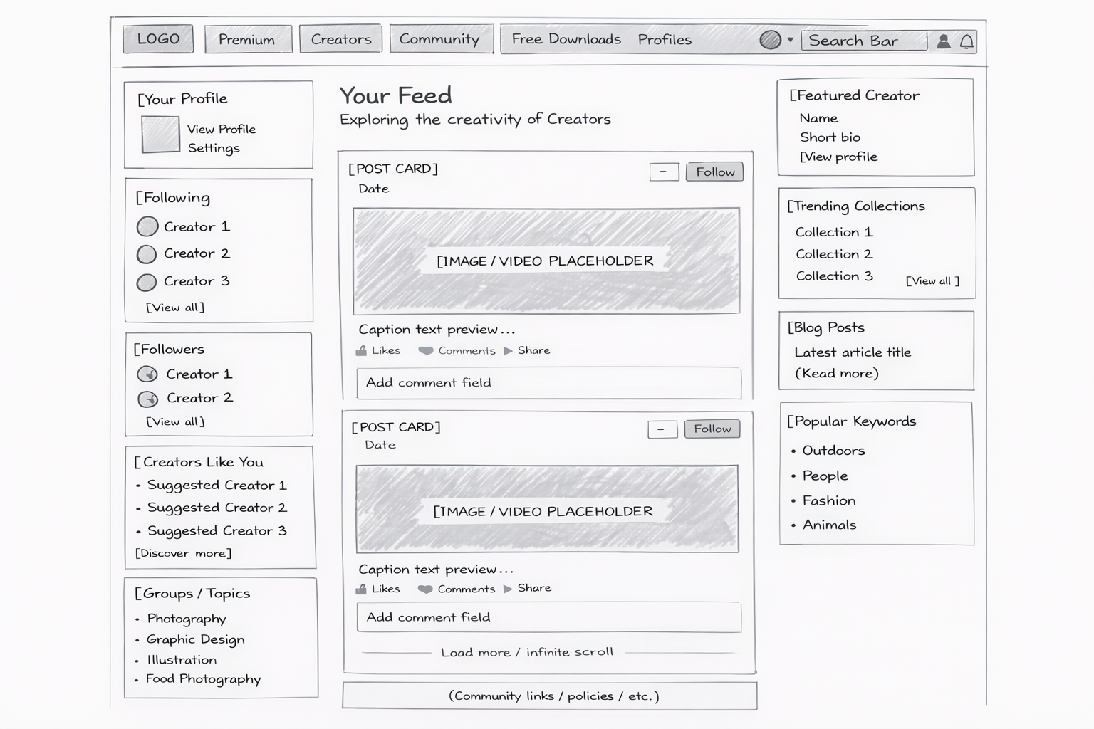 I also reviewed comparable platforms to identify familiar interaction patterns and gaps, particularly around visibility and networking for stock creators. These insights shaped a simple, feed-driven experience focused on engagement, content sharing, and strengthening the sense of community.